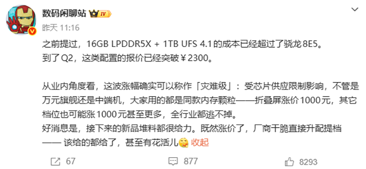 根据知名博主“数码闲聊站”的爆料,一套16GB LPDDR5X内存,加1TB UFS 4.1存储组合的成本在第二季度将会超过2300元。作为对比,高通骁龙8 Elite Gen 5处理器的成本为每颗280美元,折合人民币约为1930元。也就是说,这套组合包目前的打包价,比旗舰级处理器还要贵出19%。这一颠覆性的成本结构变化,给所有手机厂商带来了巨大的压力。可以预见,各家厂商为了保证可以获取到足够的利润,在中高端以及旗舰级手机上,未来出现大幅涨价的可能性几乎已成必然。