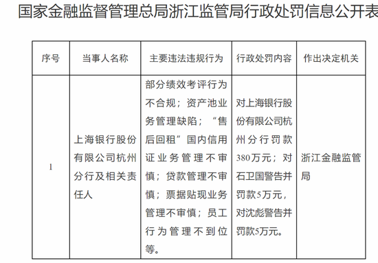 2025年8月4日,国家金融监督管理总局浙江监管局发布行政处罚信息,上海银行杭州分行涉及资产池业务管理缺陷、贷款管理不审慎、员工行为管理不到位等6项违规行为,而被罚款380万元,对两名责任人处以不同程度的处罚。
