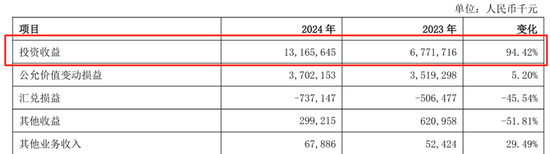 其他非利息净收入中,投资收益达131.66亿元,同比增长94.42%。投资收益占到非息净收入的64%,占到了总收入的24.85%。