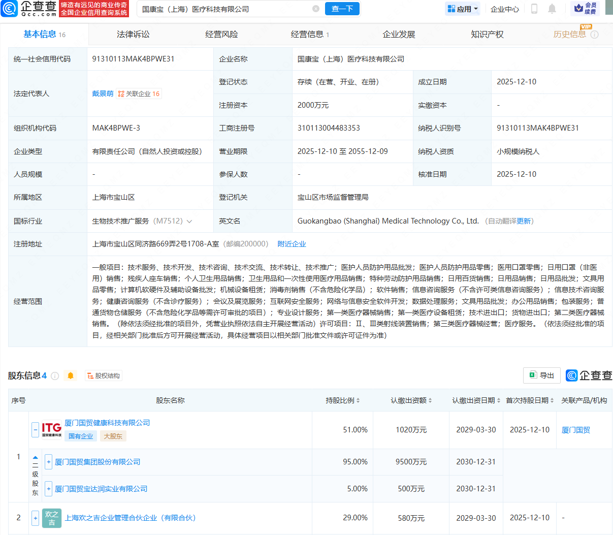 近日,国康宝(上海)医疗科技有限公司成立,法定代表人为戴景萌,注册资本为2000万元,经营范围包含:医护人员防护用品批发;个人卫生用品销售;互联网安全服务;数据处理服务;第一类医疗器械销售等。企查查股权穿透显示,该公司由厦门国贸(600755)旗下厦门国贸健康科技有限公司等共同持股。